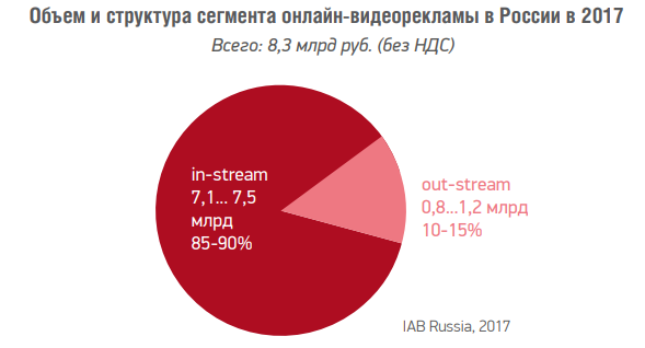 По оценкам экспертов, за 2017 год объем видеорекламы в России вырос на 26% и составил 8,3 млрд рублей. Это 24% от брендинговой рекламы в интернете и 5% от всей интернет-рекламы.