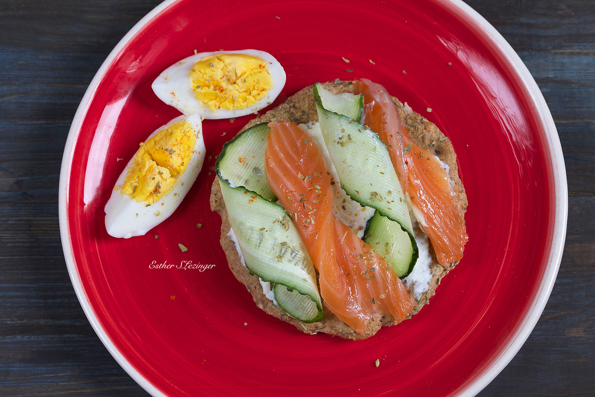 Для бутерброда намазать булочки сыром рикотта, положить слабосоленую семгу и огурец. Вкусный и полезный завтрак готов!