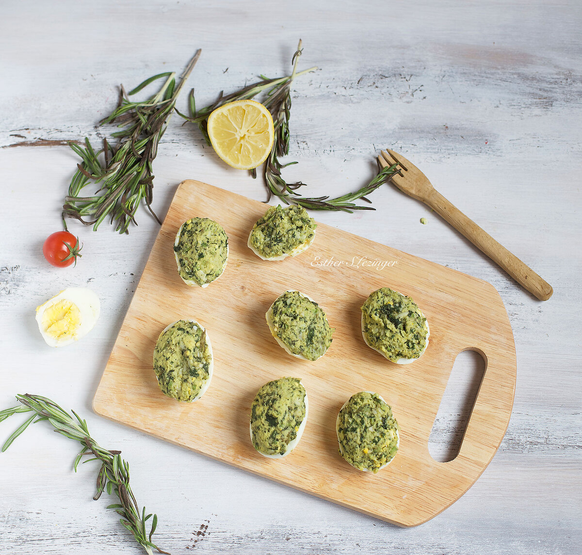 Легкий и полезный завтрак - яйца, фаршированные авокадо и базиликом. Для начинки: авокадо, 2 зубчика чеснока, пучок базилика, немного тертого сыра, чуть-чуть лимонного сока. Все взбить в блендере. Яйца отварить "в крутую", очистить, разрезать на две половинки, желтки вытащить и добавить к начинке, еще раз все тщательно перемешать. Начинку выложить в половинки яиц. Приятного аппетита!