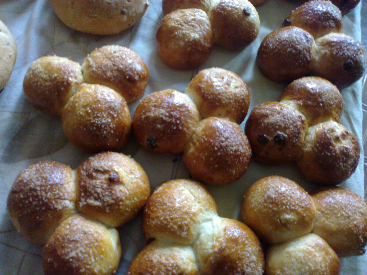 Здравствуйте, дорогие друзья. Сегодня мы с Вами будем делать сладенькие булочки. Для этого нам понадобится 500 грамм муки, 18 грамм дрожжей, 45 грамм сливочного масла, 1 яйцо, 80 грамм сахара, 5 грамм соли, 40 грамм изюма, 190 грамм молока и 2 грамма ванилина. Из всех ингредиентов замешиваем тесто и оставляем его в тёплом месте на один час. По истечению времени формируем 30 шариков по 30 грамм. Из трёх шариков делаем одну булочку. В итоге у нас должно получиться 10 булочек. Выкладываем их на противень и выпекаем 20 минут при температуре 220 градусов. Приятного аппетита.