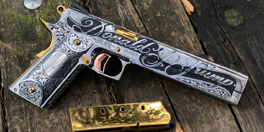Такой вот необычный и невероятно красивый пистолет разработан владельцем американской компании "JJFU" Джесси Джеймсом специально для своего товарища - президента США Дональда Трампа. В качестве базы для эксклюзивного пистолета был взят Colt 1911 калибра .45 ACP. Символичность этого выбора заключается в том, что Дональд Трамп является 45-м американским президентом, так что калибр .45 подойдет как нельзя кстати. Сам пистолет Colt 1911 является чуть ли не символом Соединенных Штатов Америки. Создан пистолет был более века назад, использовался во всех вооруженных формированиях и один из наиболее узнаваемых пистолетов в мире. Модель была принята на вооружение в 1911 году. Чтобы уместить задуманные надписи на пистолете Джесси Джеймс использовал раму Grandmaster X длиной 17 см, а так же 5-сантиметровый компенсатор. С одной стороны затворной рамы выгравирована надпись с именем "Donald J. Trump", а на другой стороне написано событие, в честь которого вручается подарок - "The 45th President o