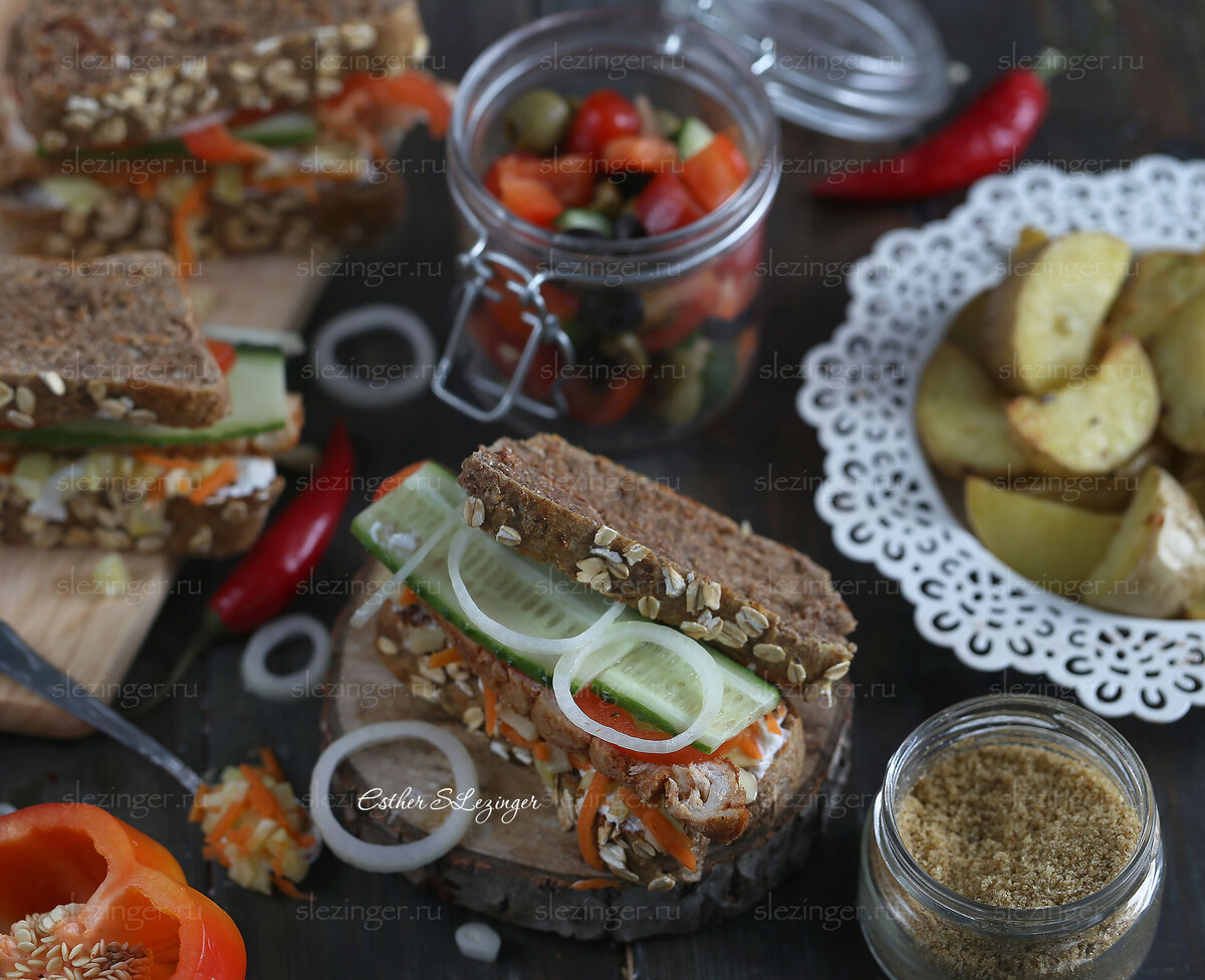 Обжариваем кусочки диетичесокго хлеба на сковороде-гриль или просто в духовке. Кусочек хлеба намазываем соусом, выкладываем салат из капусты и моркови, сверху кусочки куриной буженины, затем овощи. Накрываем вторым кусочком хлеба и подаем теплым.