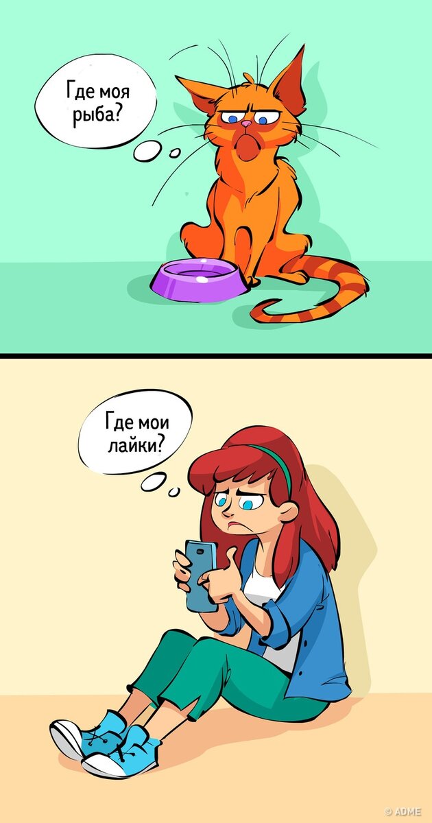 Мы сравнили девушек с кошками и нашли много общего. Если разозлить обеих, в ответ получишь угрожающее шипение, а заслужить прощения можно только вкусняшкой. В этом посте мы собрали главные признаки, по которым сразу и не поймёшь женщина перед тобой или кошка. Нам интересно, а сколько совпадений у вас? Вопреки распространенному мнению, мы не всегда получаем то, что хотим Но чаще всего добиваемся желаемого своим обаянием Мы не всегда уверены в том, сколько нам необходимо ласки. Совет: ориентируйтесь на шипение И мы не очень хорошо осознаем свои габариты Наверное, потому, что любим вкусно поесть и не умеем вовремя остановиться А вообще, мы всегда отлично выглядим. Ладно, почти всегда Хотя все же есть у нас один маленький недостаточек Зато никто не сможет сравниться с нами в гибкости. Это врожденный талант И недосып у нас тоже врожденный На самом деле нам совсем немного надо для счастья Но если уж мы чего-то захотим, то не ждите от нас тонких намеков В каких иллюстрациях вы узнали себя?