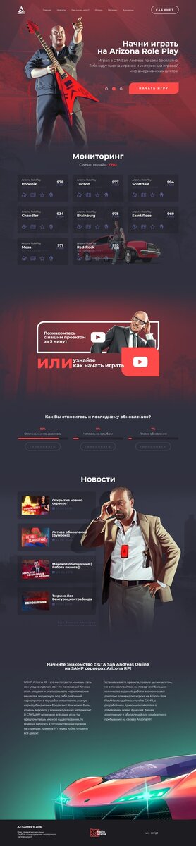 Вчера в открытом доступе была обнаружена тестовая версия нового сайта крупнейшего SAMP проекта — Arizona RolePlay. Сайт все еще находится в разработке и некоторые моменты не доделаны. К примеру — адаптация под браузеры и мобильная версия. Но из уведенного уже можно сделать вывод: сайт станет одним из самых удобных и красивых, превзойдя сайт Advance RolePlay, который на какое-то время стал эталонным для SAMP проектов. Помимо крутого дизайна на сайте появился новый функционал, о котором мы вам расскажем ниже скриншота главной страницы. На главной странице в разделе «Мониторинг» у каждого сервера появилось по 4 иконки: голосовать за сервер (ведет на сайт мониторинга), карта штата, рейтинги (игроков) и составы фракций. Еще на основном лендинге имеется блок-опрос с возможностью выразить свое мнение о последнем обновлении. Как вы возможно заметили, в конце каждой страницы имеется ссылка на страницу с «картами штатов». На этой странице можно выбрать один из серверов и перед игроком поя