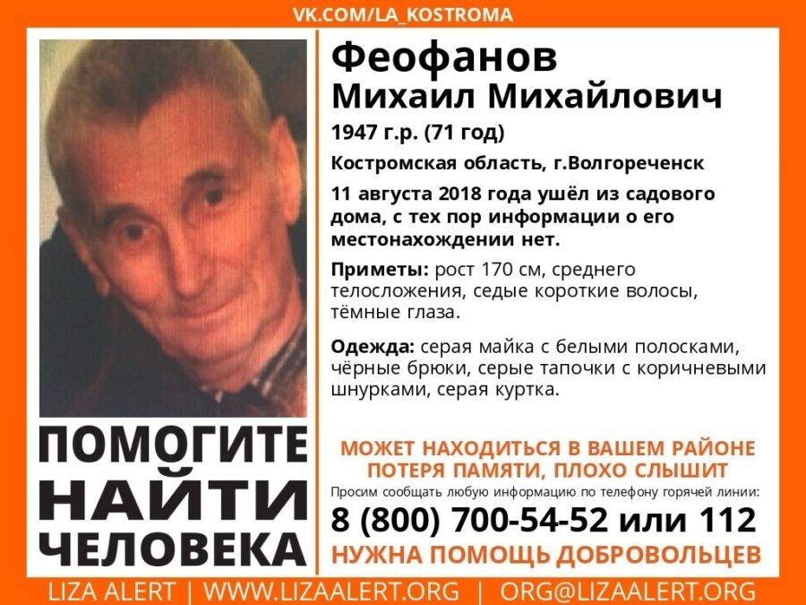 Его ищут четвертый день. Волгореченский пенсионер 11 августа ушёл со своего садового участка и бесследно пропал, узнал KOSTROMA.TODAY. На поиски уже выдвинулись волонтёры Лиза Алерт. Пенсионера зовут Феофанов Михаил Михайлович, ему 71 год. Его рост 171 сантиметр, среднего телосложение, седые короткие волосы и тёмные глаза. Был одет в серую майку с белыми полосками, чёрные брюки, серые тапочки с коричневыми шнурками и серую куртку. Если вы его видели или знаете, где находится Михаил Михайлович, сообщайте по телефону 8 800 700 54 52 или 112. Читай еще больше материалов на портале KOSTROMA.TODAY