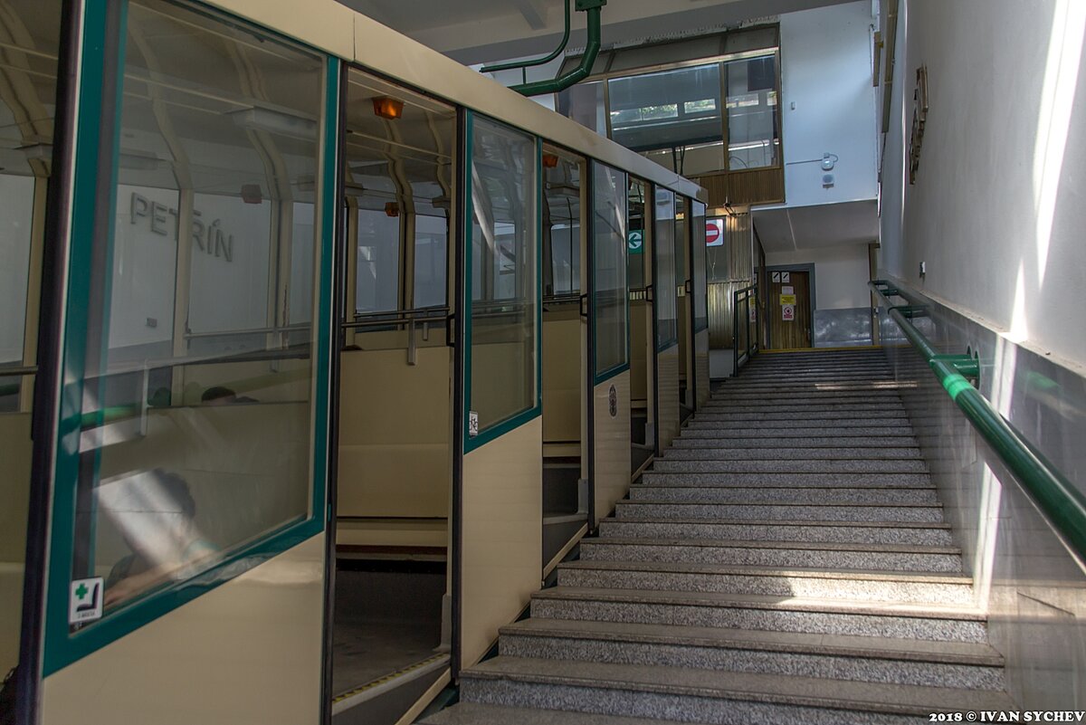 Что есть железная дорога в понимании обычного человека? Рельсы-шпалы, вагончики и станции-платформы всякие. Если рассматривать с этой точки зрения, то Пражский фуникулер - именно железная дорога: рельсовый путь ведет в очень крутой подъем на Петршинский холм, есть аж три станции, а длина всего пути составляет 493 метра - ну совсем ничего (правда если не учитывать, что весь путь - это путь вверх и под очень крутым углом - доходит почти до 296 тысячных - это как будто на 1000 м движения по горизонтали подъем по вертикали составляет 296 метров или почти 17 градусов) 1. Самая верхняя станция называется как и сам холм - Петршин(Петржин). Вот так она выглядит с остановившимся на ней вагоном подъемника. 2. А вот так выглядит пульт управления этим аппаратом (вагончиком железной дороги-фуникулера) и вид вниз, туда к станции Уезд через станцию Небозизек. 3. А вот уже путь вниз, к станции Небозизек (ее платформу можно разглядеть в правом нижнем углу). 4. Еще один вид с уровня станции Небозизек. П