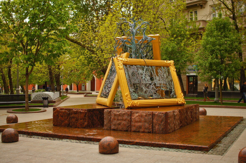 Выйдя со двора, оказываемся у истока Лаврушинского переулка. Его символизирует Фонтан искусств, открытый к 150-летию Третьяковки. Вода со стеклянных картин в рамах, как и было задумано, падает каскадом, иногда – заливает полсквера.
