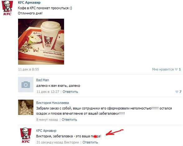 Маты, хамство, неудачные шутки и желание подняться на трендах. Недавно по Сети широко разошелся скрин-шот с комментарием Армавирского KFC, в котором SMM-менеджер ответил матом клиентке на критику заведения. Примеры такого провального (SMM - social media marketing - взаимодействие с клиентами в соцсетях) можно встретить не только в рунете или укрнете. От ошибок и неудачных не застрахованы даже мировые бренды. Так, например, в 2012 году, во время подготовки к Евро-2012, тогдашний министр инфраструктуры Борис Колесников был замечен в хамстве по отношению к собеседникам на официальной странице в Facebook.