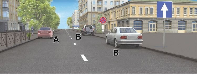 Кто в данной ситуации не нарушил правила остановки? 1. Водитель автомобиля Б. 2. Водитель автомобиля В. 3. Водители автомобилей А и Б. 4. Водители автомобилей А и В. ВНИМАНИЕ! ВНИЗУ ПРАВИЛЬНЫЙ ОТВЕТ, ЛИСТАЙТЕ ВНИЗ, ТОЛЬКО ЕСЛИ СДЕЛАЛИ УЖЕ СВОЙ ВЫБОР. ↓