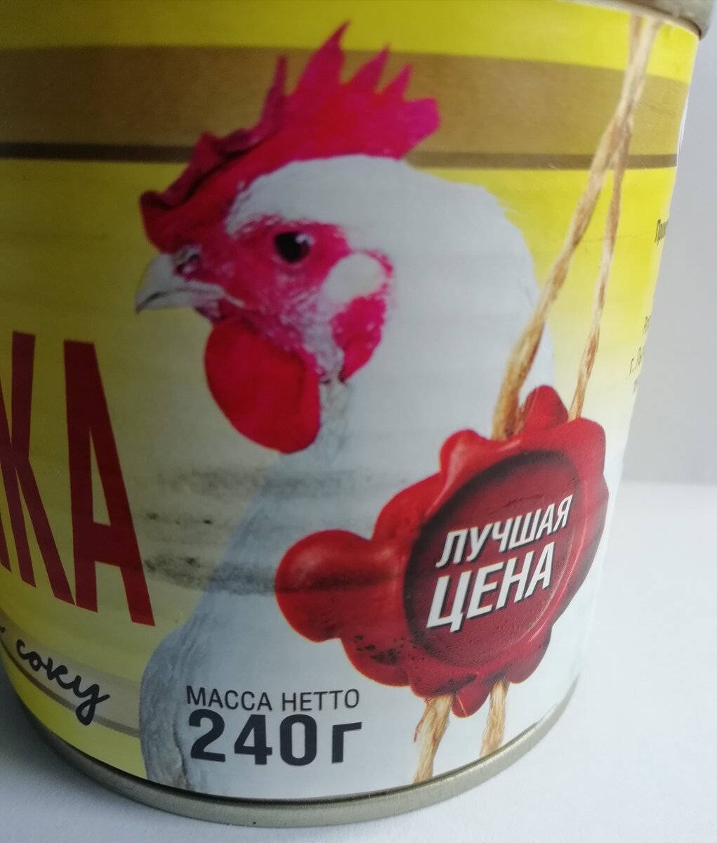 Всем привет! Сегодня будем пробовать мясо цыпленка в собственном соку изготовлено ЗАО "Лыткаринский МПЗ" Московская область г. Лыткарино по заказу ООО"РУЗКОМ" Я уже делала обзор тушенки этого производителя, покупкой осталась вполне довольна. Приобрела я данную баночку весом 240 грамм всего за 25 рублей в магазине Fix price. Внешне ни каких нареканий нет, банка не мятая, есть все необходимая информация о продукте. Начнем с состава: Состав вполне приличный, все натуральное за исключение стабилизатора каррагинана (если честно не знаю что это за штука и какая она на вкус). Открываем банку и тут начинается самое интересное.. В нос сразу же бьет резкий запах КОШАЧЬИХ КОНСЕРВОВ. У кого есть кошки меня поймут, когда покупаешь кошачью консерву в железной банки и начинаешь ее открывать, этот запах не с чем не спутаешь. Мне кажется запах похож на кошачью консерву "Ночной охотник" или по крайней мере очень близко к нему. Вот так выглядит банка в открытом виде. Внешне выглядит вполне прилич