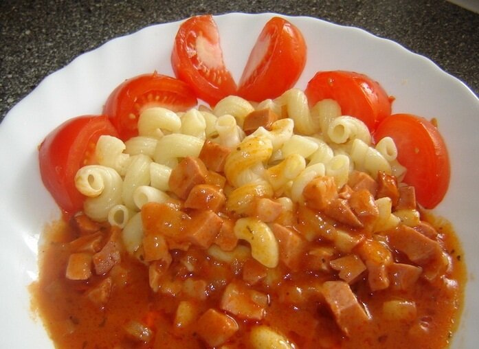 Вам понадобится: 200 гр. вареной колбасы, 4 чайные ложки томатной пасты, 2 луковицы, 2 чайные ложки муки, 1 чайная ложка сахарного песка, 1 стакан воды, 30 гр. сливочного масла, соль и перец по вкусу, зелень. Нарезать колбасу кубиками. Лук мелко порубить и обжарить на сковороде с томатной пастой. Когда лук будет готов, добавить колбасу и жарить ещё 3 минуты. Затем влить воду и довести массу до кипения. Муку развести в небольшом количестве воды. Влить в колбасную массу, добавить соль и сахар и тушить ещё 5 минут. Готовое блюдо посыпать рубленой зеленью. Приятного аппетита! Подписывайтесь на канал