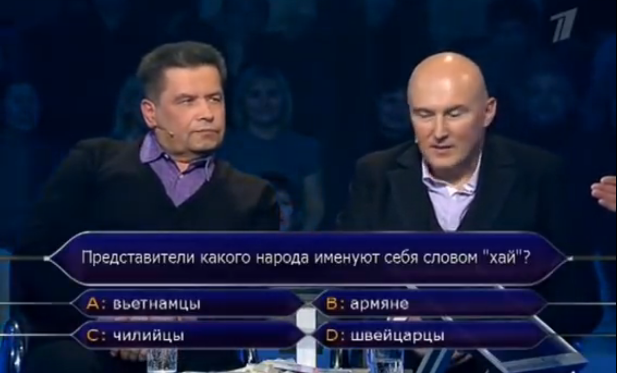 Вопрос на 800 тысяч рублей из передачи "Кто хочет стать миллионером?". Представители какого народа именуют себя словом "хай"? Варианты: А: Вьетнамцы В: Армяне С: Чилийцы D: Швейцарцы Солист группы "Любэ" Николай Расторгуев и продюсер Игорь Матвиенко не захотели взять 400 тысяч рублей и не смогли ответить на этот вопрос. Хай — самоназвание армян. Айастан — название Армении у армян или буквально "страна хайев".