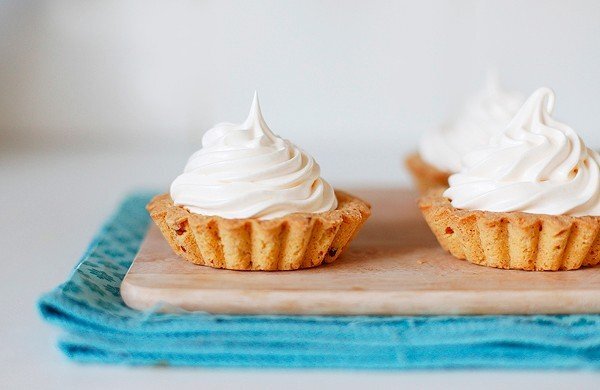 12.Сразу переложите массу в заранее подготовленный мешок с насадкой, быстро разложите по корзинкам абрикосы и отсадите крем.