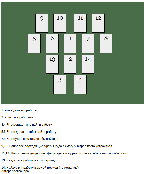 Кверентка: Есть один расклад. Я: Да? Кверентка: Сейчас скину. Я: Делаю. Я: Готовы читать? Кверентка: Да. Я: П.1, что вы думаете о работе - Изоляция, она же Замороженность. Не видите реальных вариантов, похоже. Кверентка: Есть такое. Я: П.2, хотите ли работать в принципе - Цветение. Безусловно, да. Кверентка: Именно. Я: П.3 и 4, что мешает найти работу - Терпение плюс Молния. Может, нехватка упорства? Неготовность к чему-то нудному, монотонному, типа отслеживания вакансий изо дня в день? Кверентка: Скорее всего и тут одни продавцы ищутся. Я: А работа продавца требует слишком большого терпения, на ваш взгляд? Кверентка: Скорее всего. Я: И вы отбрасываете такие варианты (Молния)? Кверентка: Не точно. Возможно, не отбрасываю. Я: Ясно, посмотрим дальше... П.5 и 6, что делаете, чтобы найти работу - Плывущий по течени.ю плюс Невинность. Ждете какой-то очень хорошей вакансии? Где все устроит? Кверентка: Смотрю и смотрю вакансии. А так же и жду подходящей. Есть такое. Так всегда. Я: П.7 и 8, чт