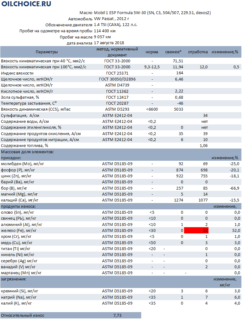 - KV100 изменилось незначительно, всего на 0,5%. Это мобил. Это спустя 5 лет после анализа свежего масла.