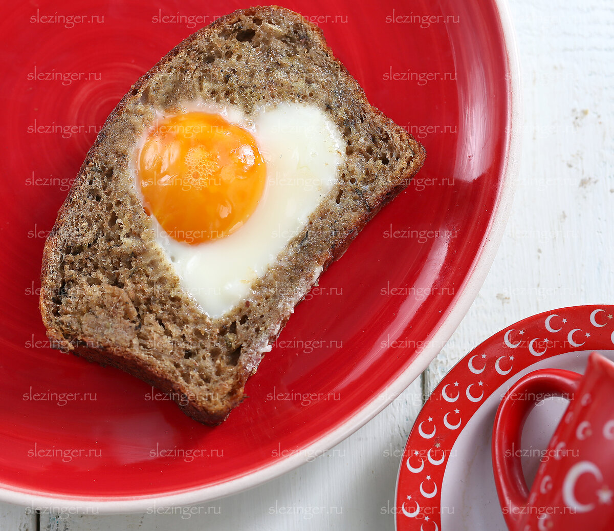 Утром готовим праздничный завтрак. С помощью формочки в виде сердечка вырезаем сердцевину хлеба. Выкладываем его на сковороду. В центр выливаем яйцо. Удобнее будет сначала аккуратно разбить яйцо в миску - так, чтобы не повредить желток, а потом перелить яйцо на сковороду. Готовим на небольшом огне под крышкой до готовности яйца.