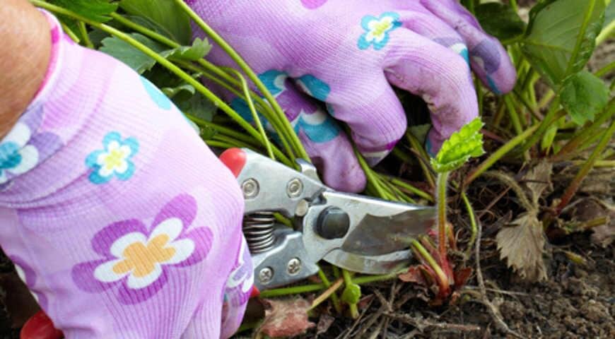 Все дачники придерживаются разных мнений по тому поводу, когда правильнее обрезать клубнику. Я же считаю оптимальное время - август, когда кустики уже отплодоносили, а впереди несколько месяцев до заморозков и клубника успеет окрепнуть и нарастить зеленую массу. Поделюсь с вами несколькими своими правилами обрезки клубники летом. 1. Для проведения процедуры используем правильный инструмент: острые ножницы, нож или секатор. Ни в коем случае не нужно обрывать листики. День выбираем сухой, теплый, но чтобы не было палящего солнца. 2. Отрезаем листики, оставляя стебельки до 10 см высотой. Не стоит убирать все под корень. Нам важно сохранить точку роста, чтобы потом оттуда выросли новые, здоровые и свежие побеги. 3. Если вы не планируете размножать клубнику, убираем всю зелень вместе с усиками. Это необходимо, чтобы кустики лишний раз не затенялись и посадки не были загущены. Если же вы хотите вырастить новые кустики, здоровые усики с розетками слегка прикапываем в землю, чтобы те укоренили
