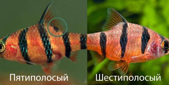 Если судить по названиям, то оба вида должны различаться количеством полос на теле, но в данном случае получилась небольшая научная коллизия, когда наименование не отражает особенность рыбок. Количество полосок для обоих видов одинаковое и варьируется от пяти до шести.