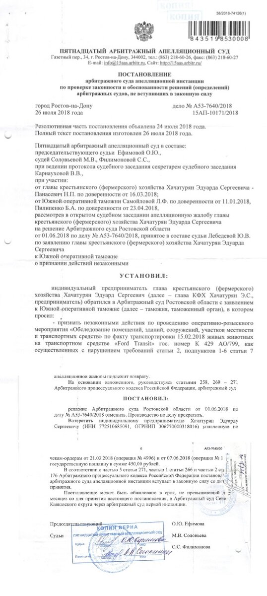 А теперь апофеоз. Ростовский Арбитражный апелляционный суд отменил решения об «аресте» обезьян, принадлежащих Хачатуряну, признав действия таможни незаконными. Вот это решение: