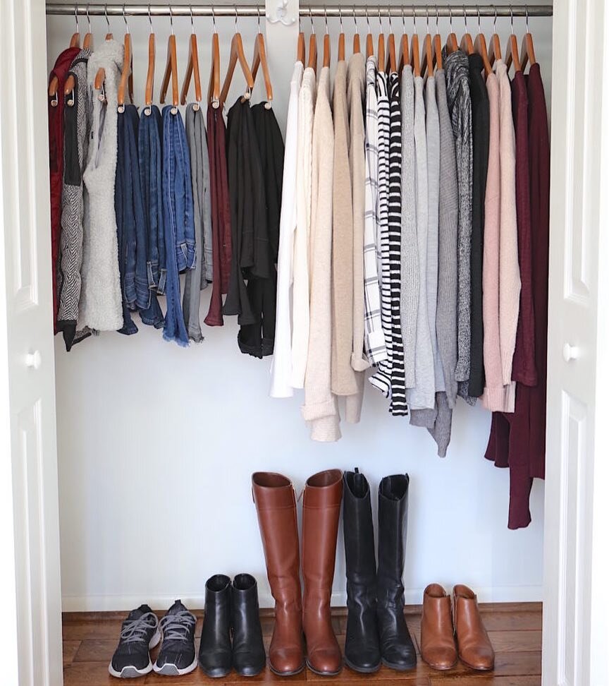 Пусть вещи из одной категории хранятся рядом: платья с платьями, а пиджаки — с пиджаками. Обращайте внимание на материалы и цвет. Темные цвета лучше хранить вместе, а светлые — в другой стороне. Такое расположение позволит, во-первых, с первого взгляда понять, что где находится, и во-вторых, поможет понять палитру своего гардероба.