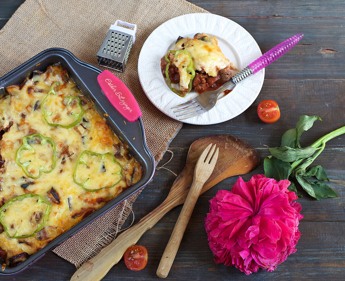 Мясо порезать на мелкие кубики, обжарить до полуготовности, посолить, поперчить. Все овощи (кроме зеленого перца) тоже мелко порезать, с помидоров предварительно снять шкуру (для этого надо обдать их кипятком). Овощи потушить до полуготовности, тоже посолить и поперчить по вкусу. Томатную пасту смешать с водой, чтобы по консистенции получилось как жидкий кетчуп. В форму для запекания положить мясо, смазать томатным соусом, сверху положить овощи, снова смазать соусом, затем опять мясо и снова овощи. Отправить в духовку на 25 минут.