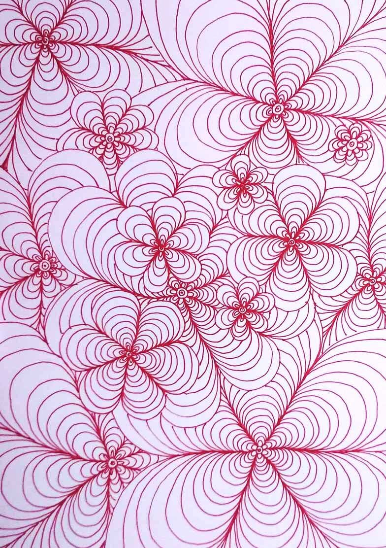 Простыми линиями можно создать ощущения объемного рисунка. Больше всего нравится рисовать узоры в виде цветов с шестью, семью или восемью лепестками. Оптимальный вариант - с шестью. А надо здесь всего лишь малое - вычерчивать дуги. Получается интересная многослойность. Кажется, что цветы эти вырастают из глубины бумаги. Еще вариант другого цвета, с более мелкими и многочисленными цветами Ну а если отойти от повторения, и делать линии произвольными, то можно получить изображение принципиально другое. На эти когда смотришь, они кажутся мягкими на ощупь. А на самом деле простейший узор. И еще одно волнистое.