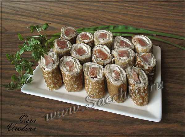 Блины приготовлены с копчёной или солёной красной рыбой и сыром (плавленым или сыром "Филадельфия"). Ингредиенты: Блины: Начинка: Как приготовить: P.S.: Роллы рашен стайл готовы :)