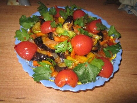 3. Во фритюрнице обжарить баклажаны и цукини до полной готовности. Отдельно в сковороде обжарить морковь, лук и перец. В другой сковороде обжарить помидоры. Их нужно разрезать на 2 части. Обжаривать срезанную часть.
