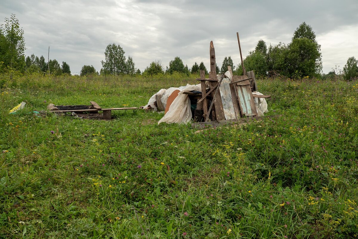 Если бы не прошел поблизости, даже не понял бы, что это не мусор, а последствия нашествия туристов или... Или бомжей... Но, простите, какие могут быть бомжи в ста километрах от ближайшего города и в двух километрах от маленькой деревушки, фактически в дебрях, лесах и полях. Здесь ни есть нечего, ни денег попросить, ни выпить. Деревушка еще и мусульманская большей частью. То, что это не куча мусора понял только по лавочке и кострищу рядом. А когда рассмотрел понял, что это жилой шалаш, навес или палатка. Что внутри кто-то ночевал, построив себе дом из найденного рядом мусора. Туристы, признавайтесь, кто себе медвежью лежку делал около виадука в Октябрьском районе? Явно ведь не бомжи там жили, а если бомжи, тогда я что-то не понимаю их формат существования. Это собственно место, ради которого ехали в Октябрьский район в формате проекта #ДзенПутешествие. Но... ни в какое сравнение с Мокринским мостом оно не идет. Подробности про виадук в следующих записях на канале "Путешествия за руле
