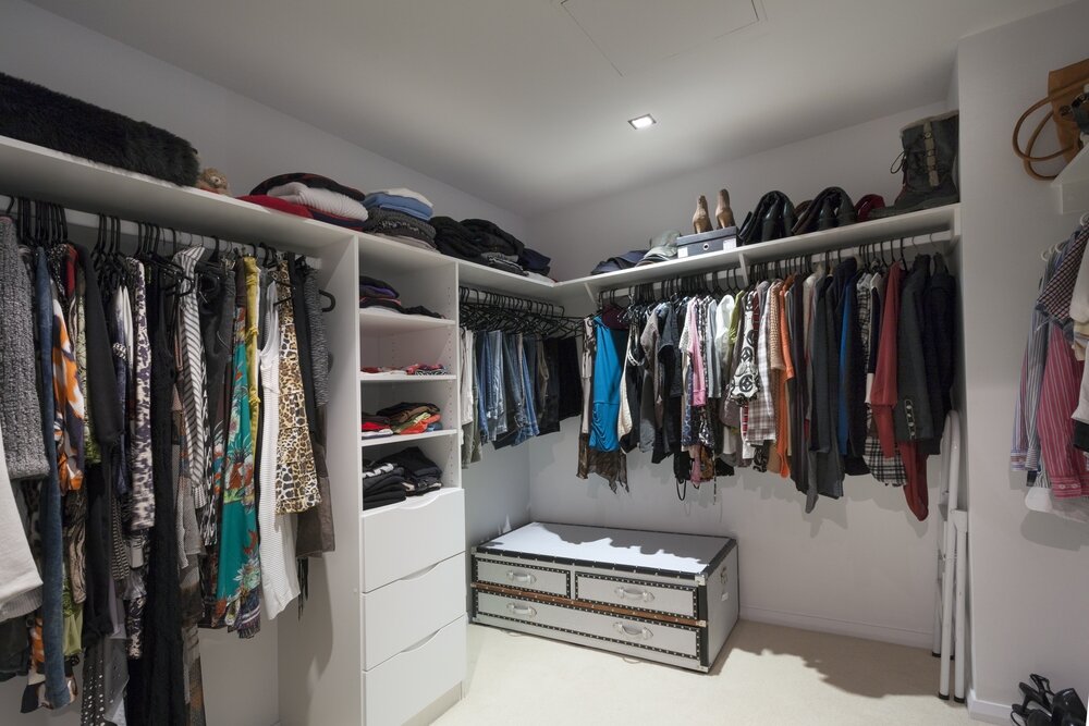Гардеробные могут занимать целую комнату либо быть отгороженной частью помещения (чаще всего спальни). Все зависит от общей площади квартиры и количества помещений в ней.