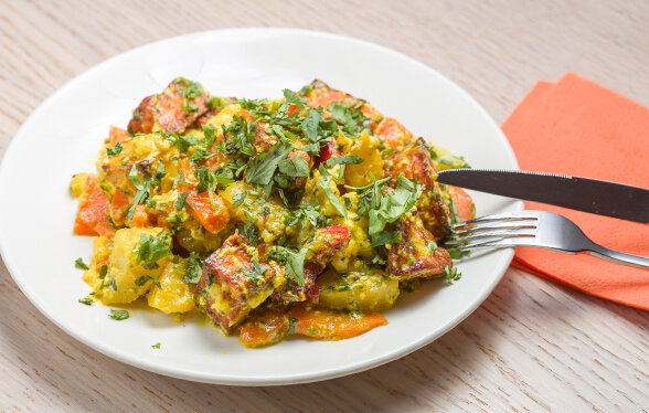 Обычно сабджи готовят, не подбирая особо овощи, из того что есть в холодильнике. Но когда в гостях тебя угощают нежным и ароматным сабджи со сливками, так хочется сохранить его рецепт и вспоминать иногда этот вкус… В этот раз у меня было: 2 баклажана, 2 морковки, 4 картошки, 200 г брокколи, 200 г адыгейского сыра, 200 г сливок или сметаны, 1 ч. л. соли, 1/2 ч. л. сахара специи, топленое масло (можно подсолнечное). Баклажаны нужно нарезать на кусочки и пересыпать солью, дать им постоять минут 20, потом промыть от соли и обжарить на масле. Картошку отварить в мундирах. На сковородке нагреть масло и слегка обжарить специи: имбирь, куркуму, асафетиду, черный перец, тмин, кориандр, корицу. На сковородку со специями выложить морковку, порезанную кубиками, слегка обжарить ее и переложить в кастрюлю, добавить туда немного воды (1/3 стакана) и поставить на маленький огонь тушиться. Потом туда же в кастрюлю складываем обжаренные баклажаны, добавляем капусту брокколи (разоб