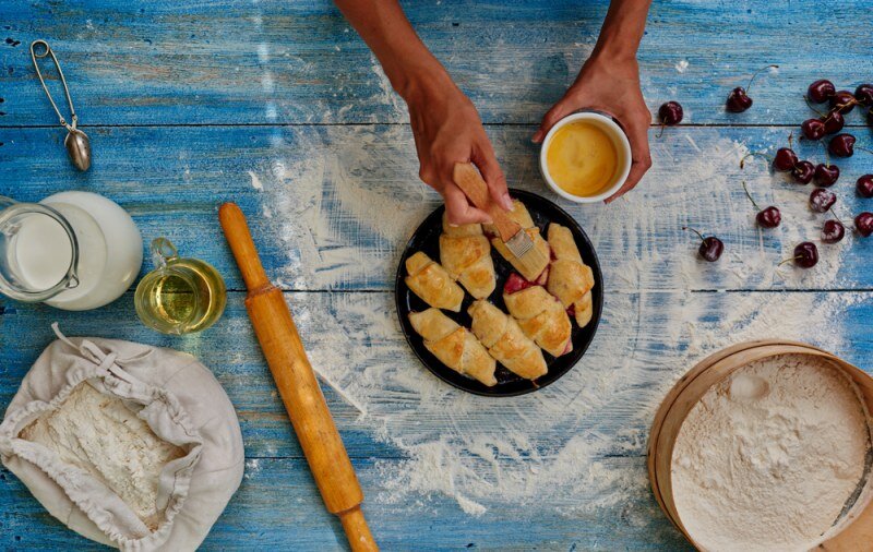 На широкую сторону треугольнику положить одну чайную ложку варенья. Свернуть рогалик.
