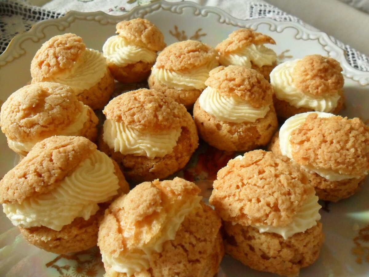 Продукты на 10 штук: мука - 260 грамм масло сливочное - 120 грамм сахар -10 грамм яйца - 2 шт желтки -8 шт соль по вкусу вода - 230 мл В алюминиевую кастрюля наливаем воду и доводим до кипения. Как только вода закипит добавьте сахар, соль, масло. Также в кипящую воду надо высыпать всю муку. Ложкой замесите тесто и проварите его минут пять. Далее следует охладить полученное тесто до 70 градусов. После этого следует постепенно, выбивая тесто, ввести желтки и яйца. На противень смазанный маслом отсадите круглые булочки. Для это возьмите кондитерский мешок с круглой насадкой и положите туда тесто. Полученные булочки выпекайте в духовке при температуре 220-230 градусов. Готовые булочки охладите и разрежьте пополам по горизонтали ( можно срезать только верхушки, как показано на фото). Середину булочек заполните сливками или сметаной, взбитой с сахарной пудрой. Приятного аппетита!