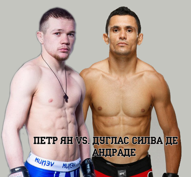 Напоминаю, что первый турнир UFC в Москве состоится 15 сентября. Приступим к прогнозу. Даглас Сильва Де Андраде - это 33 летний бразильский боец с рекордом в UFC 3-2, дебют состоялся против Зубайры Тухугова, которому проиграл решением, затем спустился в другую весовую категорию. Даглас это ударник с навыками тайского бокса, хорошим футворком и умением хорошо бить ногами. Имеет много побед нокаутами, но до UFC его противники были не слишком сильны, его рекорд составляет 22 победы (15 нокаутом), при 2 поражениях и 1 бой с отмененным результатом. Петр Ян - российский, 25 летний боец UFC, бывший чемпион лиги ACB, в июне дебютировал и ярко финишировал своего соперника. Из его плюсов могу отметить его бокс, быстрые руки, нокаутирующий удар, стойкость, а также его борьбу. Он провел 10 боев за карьеру, одержал 9 побед (4 нокаутом, 5 приемами) при 1 поражении раздельным решением. Петр выше на 5 см и младше на 8 лет, Даглас имеет преимущество в длине рук и ног на 10 см. Оба бойца ударники, Даг