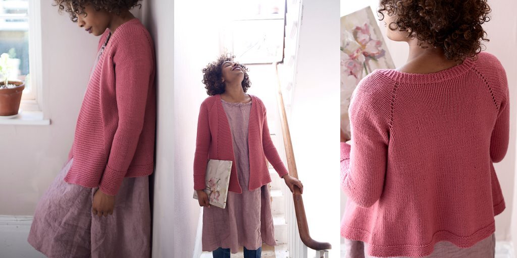 Вязание спицами для женщин жакета лицевой гладью и платочной вязкой одной деталью сверху вниз.