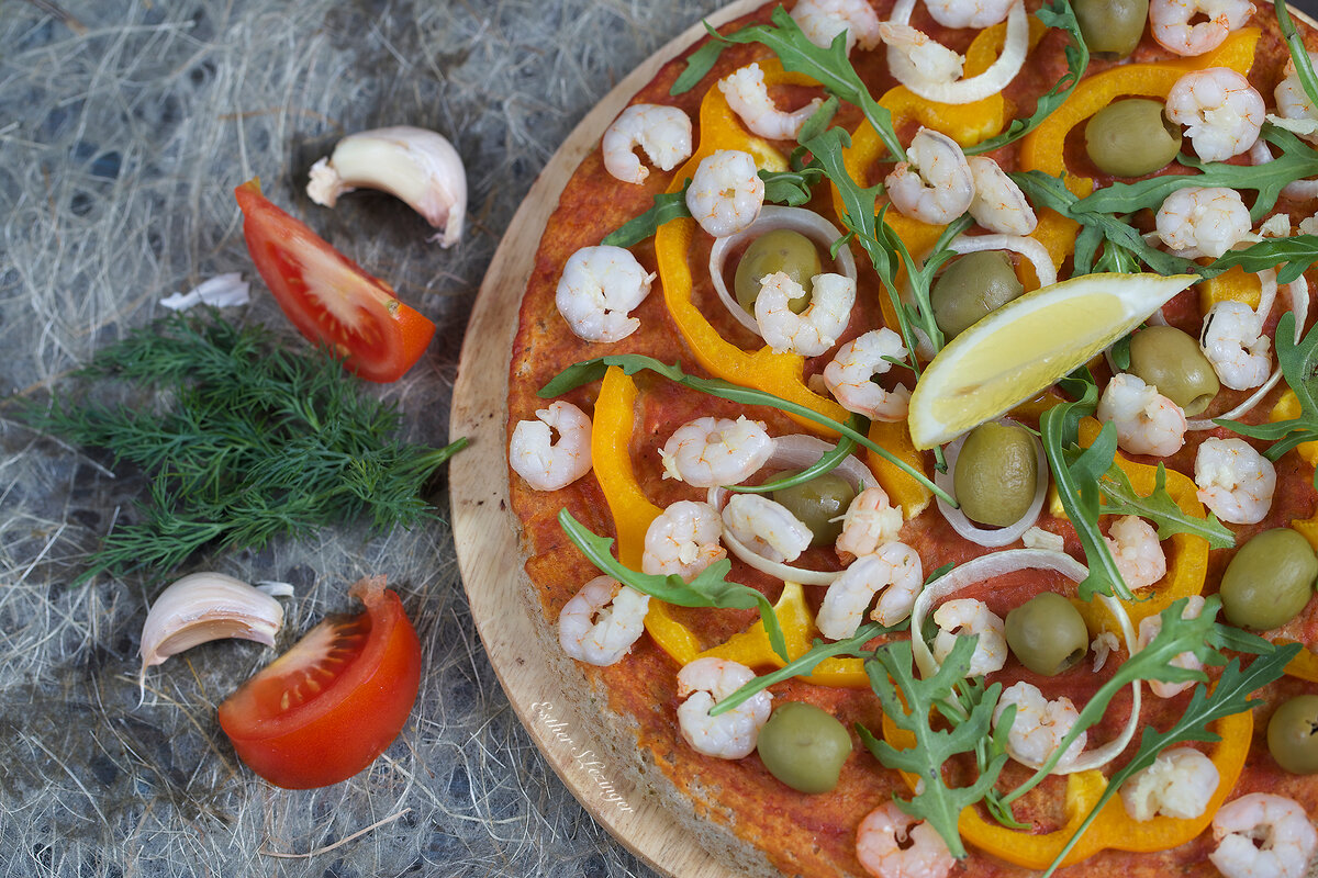 1 пачка обезжиренного творога + 100 гр. ц/з муки + 1 яйцо + соль + орегано + 1 ч.л. разрыхлителя. Все смешать, выложить в форму и выпекать 10 минут. Тем временем, креветки отварить. У меня было 80 гр. креветок. После варки я их обжарила в смеси оливкового масла, сока лимона и чеснока. Достаем основу для пиццы, смазываем ее смесью из 1 ст.л. томатной пасты и 1 ст.л. йогурта, выкладываем любимые овощи. У меня сегодня были: болгарский перец, репчатый лук, зеленые оливки. Отправляем пиццу в духовку еще на 10 минут. Когда она будет готова, достаем, выкладываем свежую рукколу и приготовленные креветки. Можно посыпать тертым сыром. Подавать в горячем виде. Приятного аппетита! Не забудьте поделиться в соцсетях: