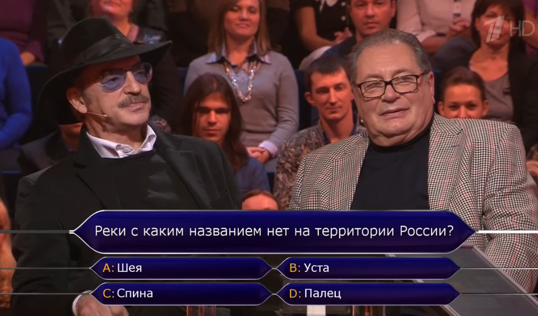 Вопрос на 3 миллиона рублей из передачи "Кто хочет стать миллионером?". Реки с каким названием нет на территории России? Варианты ответа: А: Шея B: Уста C: Спина D: Палец Михаил Боярский и Валентин Смирнитский ответили правильно, но решили перед этим взять деньги — 1,5 миллиона рублей. Реки Спина нет в России. Шея находится в Нижегородской области, Уста — в Нижегородской и Кировской областях, Палец — в Нижегородской области.