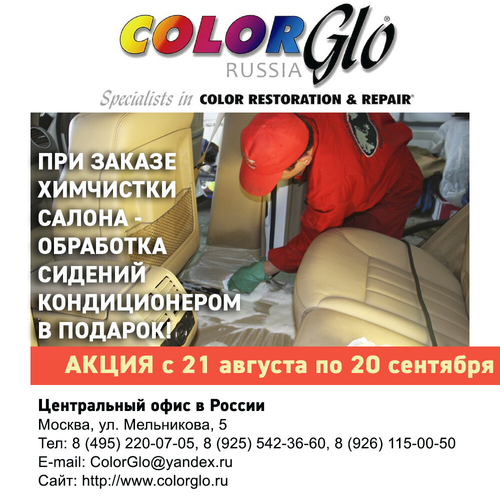 АКЦИЯ В АВТО-АТЕЛЬЕ COLOR GLO RUSSIA: ПРИ ЗАКАЗЕ ХИМЧИСТКИ – ОБРАБОТКА КОНДИЦИОНЕРОМ В ПОДАРОК! При заказе химчистки салона автомобиля – обработка сидений кондиционером БЕСПЛАТНО. Обработка кондиционером – неотъемлемая часть ухода за кожей в салоне вашего автомобиля. Мы рекомендуем нашим клиентам регулярно обрабатывать сиденья автомобиля профессиональным Leather Conditioner Color Glo для кожи. Как действует кондиционер для сидений? >>> подобно крему для рук >>> делает кожу сидений мягкой и приятной на ощупь >>> предотвращает появление трещин и заломов на поверхности. Результат: безупречный вид салона вашего авто надолго! Почувствуйте разницу! Успейте попробовать БЕСПЛАТНО с 21 августа по 20 сентября. «ХИМЧИСТКА САЛОНА АВТО» http://www.colorglo.ru/uslugi/khimchistka-salona/ #color_glo_russia #автоателье #химчистка #химчистка_салона #химчисткаавто #ремонт_салона #реставрация_салона #ремонт_сидений #ремонт_прожогов #автоцарапина ---------------------------------- Color Glo Russia Ад