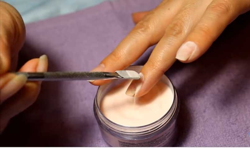 В видео есть возможность посмотреть процесс нанесения акрилового порошка.
