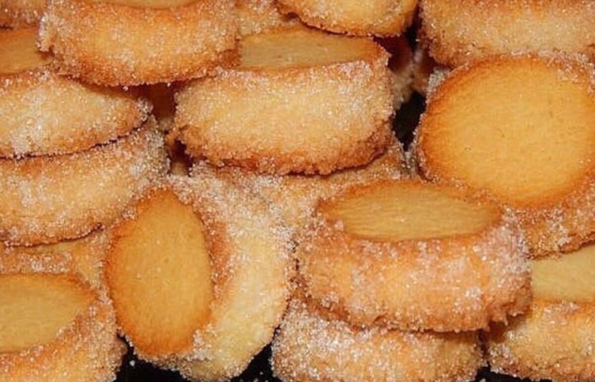 Нам понадобится: Мука пшеничная - 330 г Масло сливочное (комнатной температуры) - 230 г Сахарная пудра - 100 г Ванильный сахар - 1 пакетик Лимонная цедра - натёртая с одного лимона Соль - 1/4 ч л Маленькое яйцо - для обмазки Крупный сахар - для посыпки Начинаем готовить: Просейте муку через сито. Натрите лимонную цедру на тёрке. Поместите масло в миску и добавьте сахарную пудру. Взбейте до образования пышной сливочной массы. Добавьте ванильный сахар, соль, лимонную цедру и муку. Быстро смешайте до однородного теста. Разделите тесто на три части. Сформируйте валики 2-3 см диаметром, оберните пищевой плёнкой и уберите в морозильник на 15 минут. По прошествии этого времени, извлеките тесто из морозилки и снимите плёнку. Разболтайте вилкой яйцо в стакане. Посыпьте разделочную доску крупным сахаром. Смажьте валики из теста яйцом и прокатайте в сахаре. Затем нарежьте тесто кружочками 1,5-2 см толщиной. Смажьте противень маслом или застелите пергаментной бумагой. Выложите кружочки из теста на