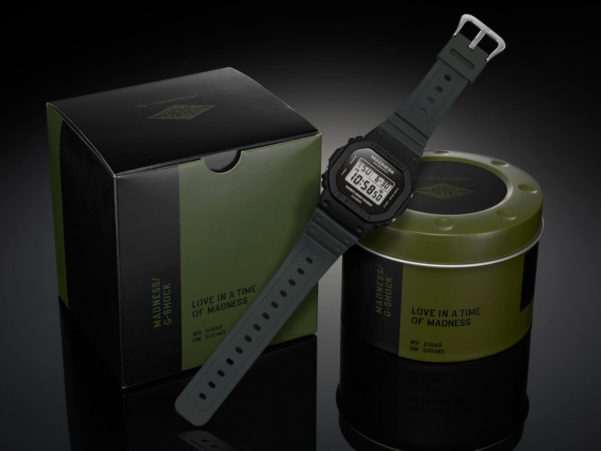 Новая лимитированная модель DW-5000MD отсылает к самым первым G-SHOCK, с их угловатым резиновым корпусом и надёжным дизайном без чего-либо лишнего. Вдохновившись эстетикой милитари, бренд MADNESS привнёс свой взгляд и сделал из часов незаменимого компаньона для городских джунглей. Коллабоорационная модель часов G-SHOCK × Madness DW-5000MD покрыта тёмными матовыми оттенками, включая корпус и ремешок, в то время как вокруг циферблата с традиционным функционалом G-SHOCK находится узор сетки Рабица. Там же, сверху, распроложен брендинг MADNESS, а снизу — фирменный слоган «MADNESS BREED MADNESS» («Безумие порождает безумие»).