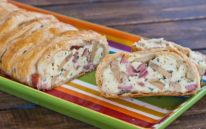 Для начала в сковороде обжариваем грибы. Затем режем кубиками ветчину. Добавляем к грибам и жарим еще около 3-5 минут. Сыр трем на терке, укроп мелко нарезаем. Яйца слегка взбиваем и перемешиваем с сыром и зеленью. Заливаем этой смесью грибы с ветчиной и готовим помешивая около 4-5 минут. Не забываем посолить и поперчить. Слоеное тесто тонко раскатываем. По бокам делаем ножом надрезы (одинаковое количество с каждой стороны). В центр выкладываем начинку. Плетем косичку. Смазываем взбитым яйцом и выпекаем в разогретой до 190 градусов духовке 20-25 минут. Вынимаем из духовки и даем немного остыть. Приятного аппетита! Источник: https://vkusnodoma.net/yaichnica-boltunya-v-sloy
