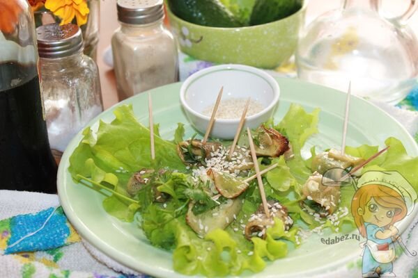 Для любителей новых вкусов подойдут жареные огурцы с чесноком. Нейтральная огуречная основа пропитывается соево-медовым соусом и жарится в растительном масле. Затем слайсы сворачиваются в миниатюрные рулетики с начинкой из свежей зелени с измельченным чесноком. Получается оригинально и очень вкусно. Закуска имеет яркий пикантный вкус. Подойдет для фуршетов и домашних вечеринок. Конечно, при условии, что не планируются романтические встречи. Ингредиенты: огурцы – 2 шт.; чеснок – 2 зубчика; листья салат – 3 шт.; петрушка – 30 г; соус соевый – 2 ст. л; мед – 2 ст. л; масло растительное – 1 ст. л; кунжут – 1 ч. л; соль, специи – по вкусу. Рис. 1 Приготовление Огурцы выбираем крепкие, свежие. Моем их и просушиваем. Листья салата и петрушку или другую зелень по вкусу ополаскиваем и обсушиваем. С огурчиков снимаем кожуру. Нарезаем их полосочками по 3-4 миллиметра толщиной. Готовим маринад. В пиале смешиваем соевый соус, растительное масло и мед. Маринад хорошо перемешиваем и выливаем в тарелк