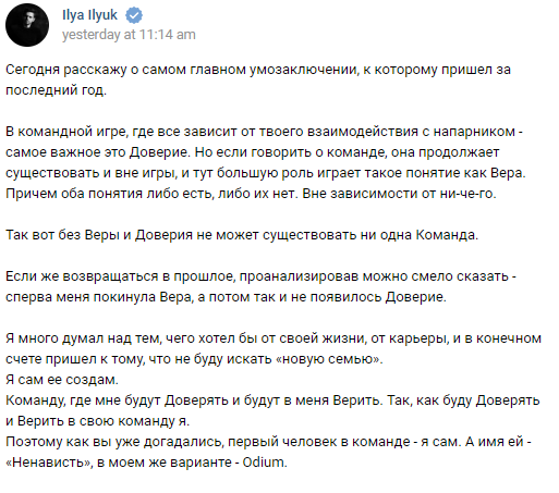 После исключения из состава Рожденных Побеждать Илья Lil Ильюк объявил всем о своем желании создать свою команду, основанную на Вере и Доверии 60% состава нам уже известно: мидером новоиспеченного коллектива стал уже известный игрок не менее известной организации - Виктор GeneRaL Нигрини, сложную линию будет занимать Андрей Ghostik Кадык, а пятую позицию будет отыгрывать только что переведенный в инактив Vega Squadron CeMaTheSlayeR (сам Илья ожидаемо занял свое законное место 4ки). Позиция керри нам пока что не известна, но многие пользователи различных ресурсов и соц. сетей активно продвигают на это место 2 кандидатуры: ALOHADANCE и, собсна, Папича. С уверенностью утверждать, что кого-либо из них возьмут нельзя, но и пространства для маневра у Lil'a не так-то много, ибо опытных игроков на СНГ-сцене осталось не так уж много. А если по теме... На самом деле сложно уже сегодня определиться выстрелит ли состав или его затянет в круговорот СНГ-противостояний тир-2 коллективов. Однако, можн