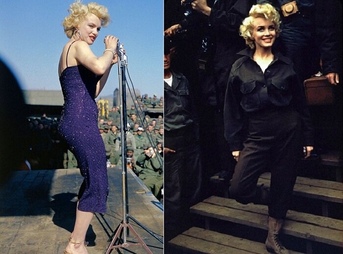 Мэрилин Монро была и остается символом эпохи 1950-х и кумиром последующих поколений. Помимо выступлений на съемочной площадке, в 1954 году актриса не побоялась отправиться в свое первое турне в зону корейского конфликта, чтобы поднять боевой дух американских солдат. В февральскую стужу звезда выступала в легком вечернем платье. Но и бесформенном военном наряде она выглядела не менее сексуально. В январе 1954 года Мэрилин Монро вышла замуж за американского бейсболиста Джо Ди Маджио. Медовый месяц молодоженов совпал с запланированной поездкой супруга на соревнования в Японию.