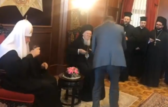 Фото: YouTube Архиепископ Памфильский Константинопольской церкви Даниил заявил, что слухи о попытке отравления патриарха Варфоломея во время встречи с главой РПЦ патриархом Кириллом является на 100% ложными, об этом он написал на своей странице в фейсбуке. По словам священника, человек, предлагавший священникам воду, был сотрудником Константинопольской церкви, в чьи обязанности входит такая деятельность. Даниил также заявил, что выпил стакан воды из рук этого сотрудника в присутствии генерального консула Украины Александра Гаманы и консула Михаила Вдовиченко. «Вода была вкусная», — заявил архиепископ. Представителю Константинопольской церкви пришлось выступить с опровержением после того, как в фейсбуке Украинской поместной православной церкви было опубликовано видео, на котором человек в сером костюме с подносом воды предлагает воду собравшимся священникам. На видео видно, что патриарх Кирилл тянется за стаканом воды, но некий сотрудник охраны из-за спины передвигает его руку к друг