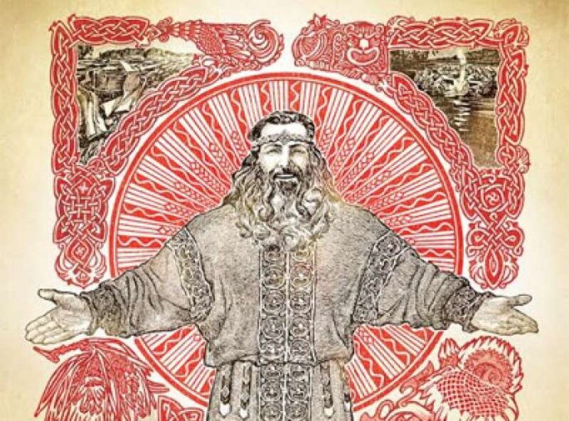 Там, прикованный к скалам цепями тяжкими, умирал светлый воин Дажьбог. Но над ним руки-крылья свои Жива раскинула, и тогда новая жизнь могучей струёй вливаться в Дажьбога принялась. Вливались в него огонь и вода, небо и земля, и любовь беззаветная девичья вливалась в Дажьбога-воина.