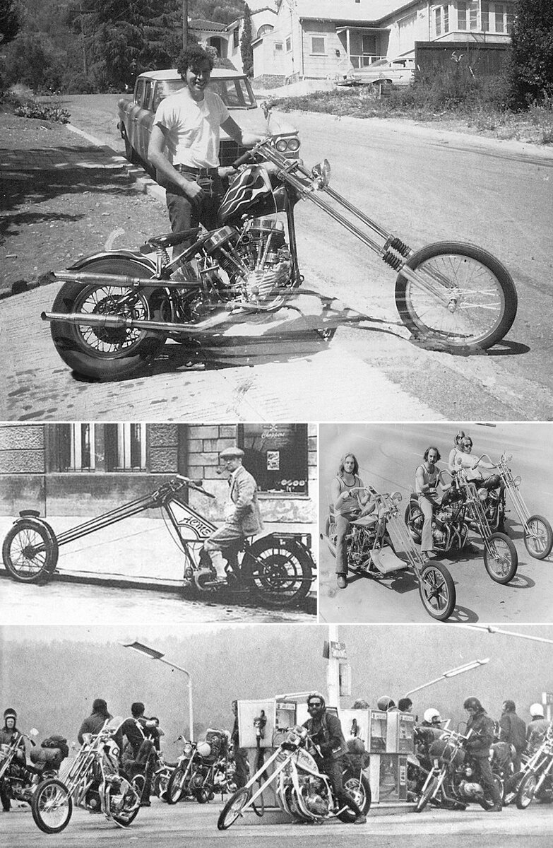 В 1960-х культура кастомайзинга после работы исключительно на скорость и легкость окунулась в эпоху выпендрежа, китча и нонконформизма. После многих лет скоростных и мощностных доработок без оглядки на стиль и красоту пришло время ярких, стильных и чрезвычайно вычурных модификаций. В первую очередь под нож пошли рамы — доработка коснулась угла установки передней вилки. Многие байкеры, конечно, до сих пор утверждают, что основная фишка чопперов — безумная длинная вилка с диким рейком — изначально была абсолютно утилитарной. По-своему это верно — длинная вилка под большим углом позволяет очень уверенно, хоть без рук, ехать по прямой дороге, коих в Штатах очень много. Но вот поворачивать и маневрировать сложнее в разы, уж тем более если вилка выше человеческого роста. Недаром во многих штатах есть законы, ограничивающие длину вилки и угол ее установки, как и высоту руля.