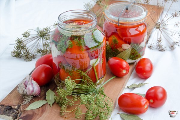 • сахар – 10 г. Способ приготовления: 1. Овощи помыть и уложить плотненько в литровую банку, прокаленную в духовке или СВЧ. Заправить томаты специями. Положить в банку веточку базилика. Заготовку встряхнуть пару раз, чтобы семена горчицы и перца распределились внутри. 2. Вскипятить рассол, смешав литр воды с сахаром и солью. В кипящий рассол прибавить уксус, полминуты подержать на огне и переправить в помидоры. 3. Стерилизовать наполненную банку 15 минут. Закатать, остудить в перевернутом виде, по желанию укутать, чтобы консервация отдавала тепло медленно. Удачи! Много интересн