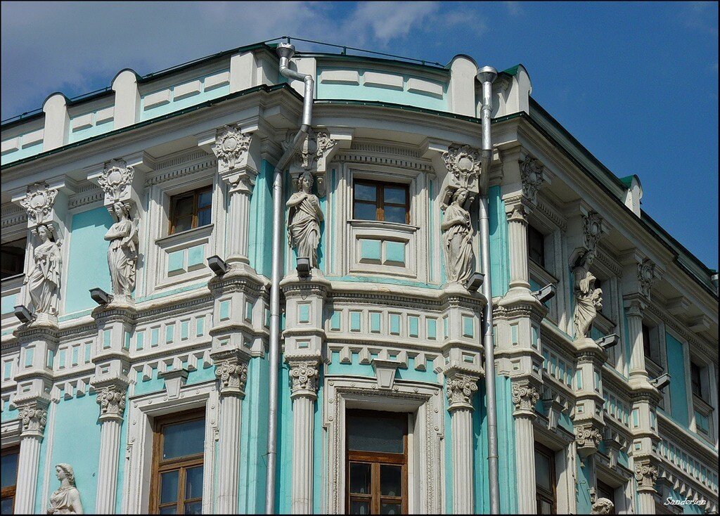 Угол знаменуется принаряднейшим голубым зданием — бывшим главным домом усадьбы графа Румянцева-Задунайского, теперь посольством Белоруссии (№ 17/6). Впрочем, сначала, в 1782 году, большой каменный трехэтажный дом был построен для полковника Хлебникова. По поводу архитектора историки так и не сошлись во мнениях, но в любом случае полковник выбирал из лучших — автором проекта называют либо Василия Баженова, либо Матвея Казакова.